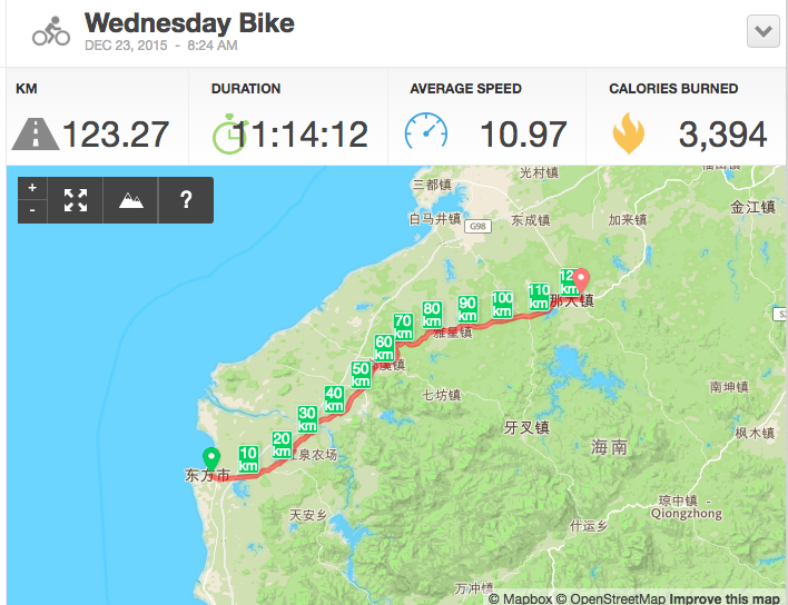今天的距離雖然比昨天短,但困難度卻大於昨天。全程是波浪狀的上坡與下坡,而且是海南開發最晚的一塊,路上的沙石更多,騎行多了一點的顛簸。可能是昨天的長程快速的拉距,醫生的左膝蓋有點發炎,導致爬坡時的疼痛。這個疼痛讓他決定上坡用牽的,下坡才用騎的。他可能沒想到我一開始就決定會全程走在他後面。我一直等待機會証明他們與我同行是美麗的結合。原本他們是要走中線與東線,是我提議東西線才是像樣的環島圓滿線,三人才有機會偶遇的全程騎完環島。要証明一個人的价值,耐心的等待是必須的,就像投資時等待低點的到來。此時的放慢速度也間接讓我的雙腿多了喘息的機會。這是上天的安排 : 一次完美的海南環島三人行。