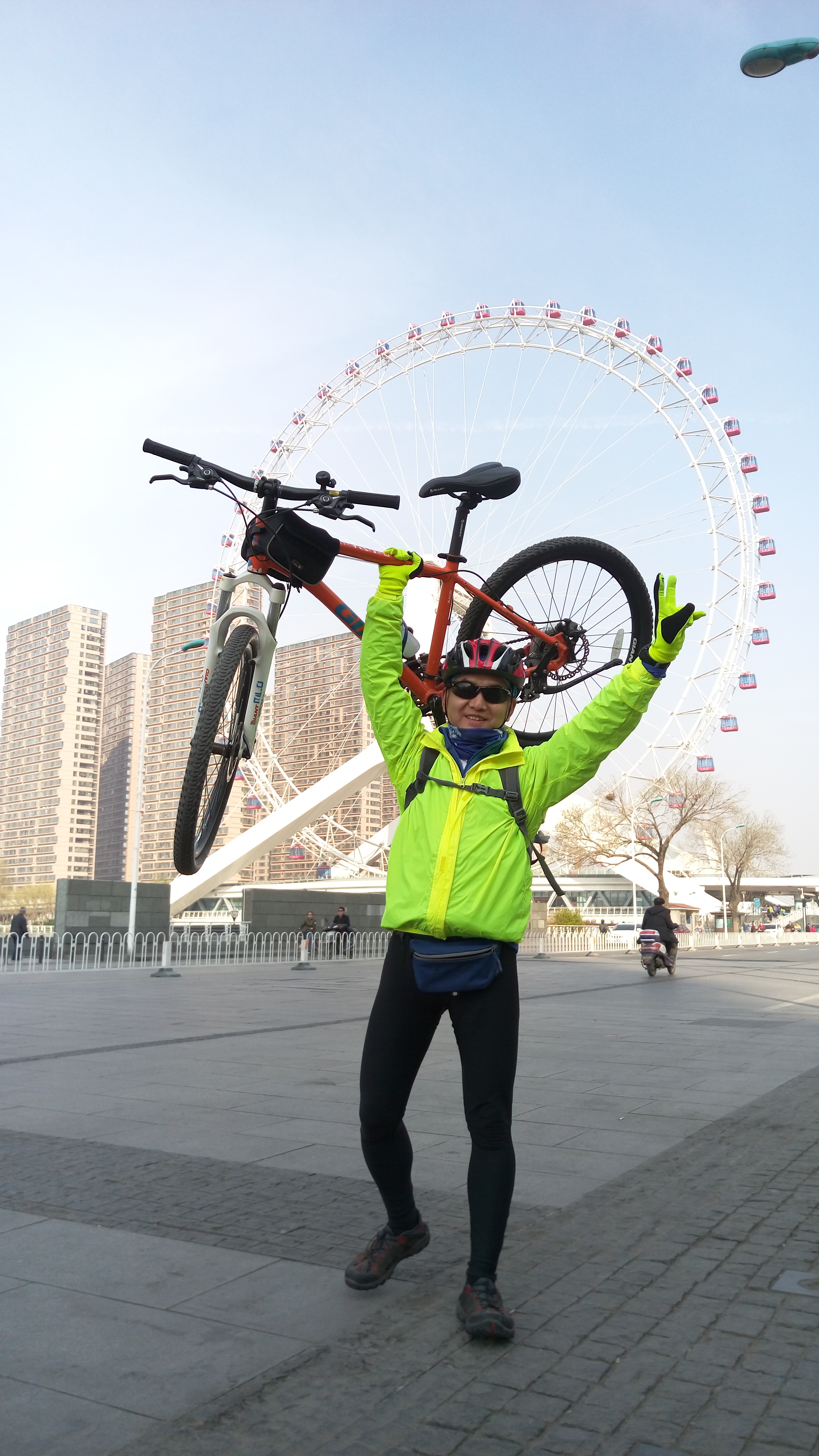 再次造訪天津,整個視野多了好多高聳的建築物。也許是騎行進入這個城市,第五大道洋氣的建築物,感覺卻從以前豐富的油畫畫面轉换成淡淡的水彩潑墨 ; 心情的定位的確會影響一個感受的輪廓。 在離開天津前往北京的早上,大家在天津之眼之前照了張相片留念。 我也在天津之眼之前照了張舉起單車的相片, 好像是馬戲團裡面的特技演員,往前穿越了火圈的表演,又完成的一項即定工作清單。