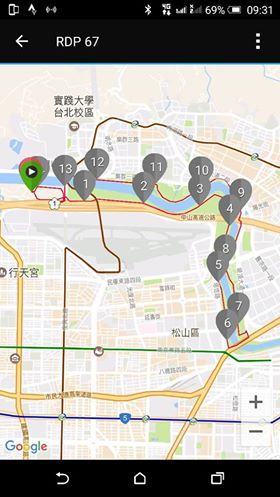 大佳公園(基隆河南岸)→(往東)過民權大橋→(往北)過麥帥一橋→(往西)過彩虹公園→大直橋→(往南)回大佳公園