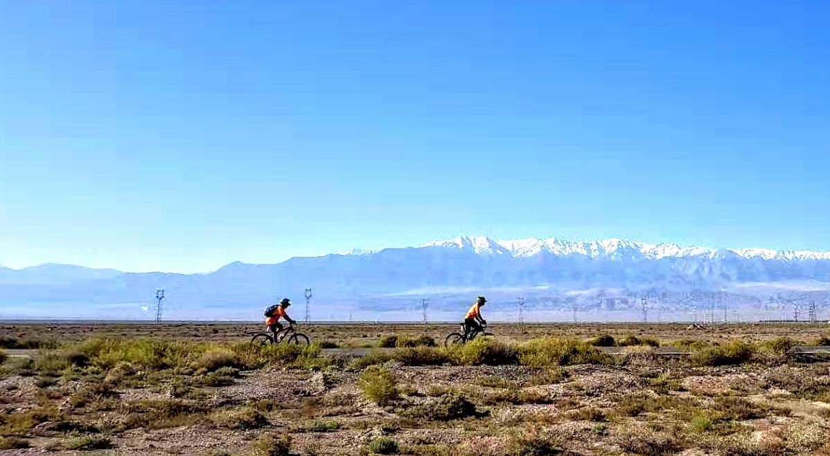 早上是緩上坡,但順著風勢和溫和的陽光,一路順暢。沒有強風和下雨,戈壁灘騎車是在擁抱一個遼闊的空間。特別是一路上都看得到祁連山上的積雪。非常美麗。祁連山是西北河西走廊最重要的一座山。我們看到的雪景都是海拔四千公尺以上的高度。綿延近千里的祁連山是那麼的美麗又莊嚴。在祂的底下俯首膜拜前行,就和在青海湖繞湖騎行一樣,有一種對大自然的虔誠感恩心情。