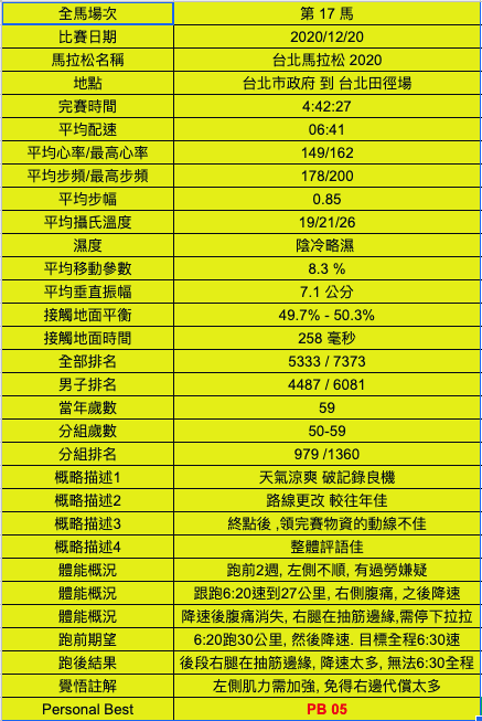 在得知跑團的卓大要帶雅雯6:20均速,我盤算著"分段配速"或許可以跟到30公里後再降速;不料確在27公里處感到側腹痛,隨即放棄跟跑。降速後腹痛感馬上消失,但隨即而來的抽筋感,配速拉不起來。10月份南庄馬時有嚴重抽筋經驗,知道處理抽筋要在發生前處理,且不能瞬間停下。只能在感覺要抽筋前先拉伸一下再跑。中間停了5到6次,心中盤算著是否有進步1分鐘的可能;就這樣拖到終點後才大抽筋。對於抽筋,就本身的情況而論,我研判是長距離的練習不足。