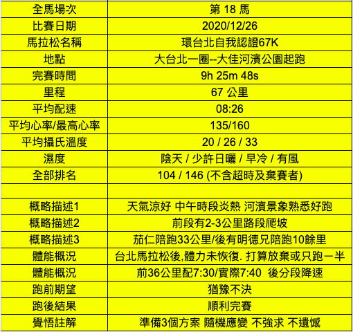 因為疫情,4月份環台北的認証改到12月26日;沒想12/20的到台北馬也中籤了。台北馬是年度主要賽事,自然不能放棄。67公里的環台北,原本預估完賽不是問題,只是擔心這麼長的距離會不會傷害到尚未恢復的肌肉。因此,賽事前一天,完全處在搖擺不定的情緒中。最後在茄仁的陪跑建議下躊躇完全。