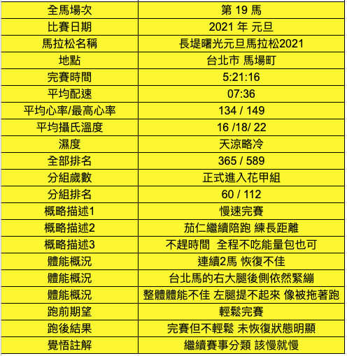 這場賽事的天氣比想像的好。統計數字顯現前50%的成績已經到了4小時8分;比台北馬的中位數還快幾分鐘。這是好事;也期望新的一年,自己還有進步的空間。事實上,對跑步經常性的定期付出,它的回饋也悄悄的來,就算在速度上沒有顯著加快,體能也可以感受到些許的增強。我感覺:試試更快的速度,更遠的距離,更頻繁的操練有如超前部署般,可以知道身體體能何處不足;事前的防範與加強,會減少未來的衰退在不知覺中來襲的機率。很明顯,今年的重點,就是要加強跑步所需肌力與彈性,特別是左邊。