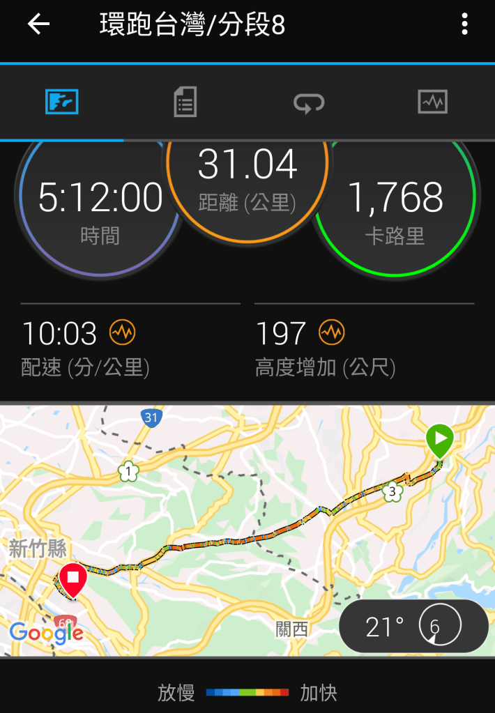 不管速度多慢,只要確定是向前方的方向,最後總會到達目的地。為了增加"自我滿意"的"成就感",我們把環跑路線分成北/中/南/東段四部份;不同於行政區的劃分法,新竹以南到嘉義則列為[中段]。我們並沒有很明確的邏輯決定分段的原則,只是大約均分跑步的路段距離或時間。比較期待的是:中段以後必需住宿,採取連日跑的試驗。能不能如願,要試試後才能下定論。中段以後離家越來越遠,當日往返明顯不符合時間與金錢的如意盤算,不如就放慢速度當耐力練習。這樣有一點點可控制的不確定性,似乎也增加些許熱度在無法控制的花甲之軀上。北段的環跑台灣行程,於此宣佈完成,下次將起程兩日連跑的中段環跑台灣。
