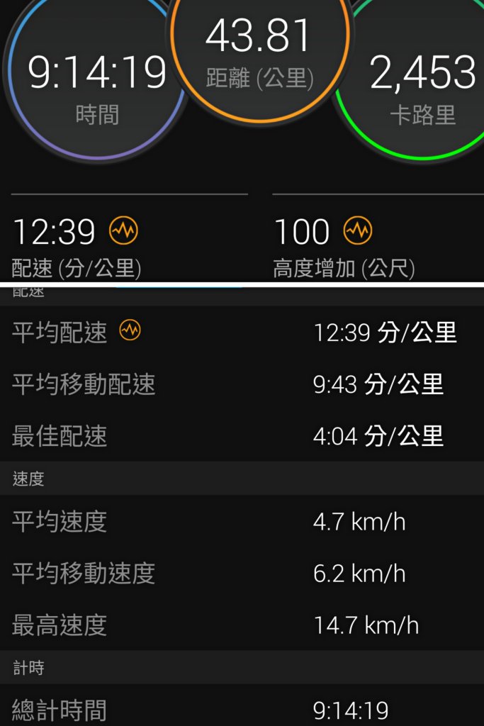 這次的環跑,雖然速度很慢,但本質上還是跑步;只是休息點多一些,拖累了全程配速。今天有機會徒步大半以上路程,可以確定徒步累人程度不輸跑步;但使用的肌群不同,二者還是有明顯不同之處。