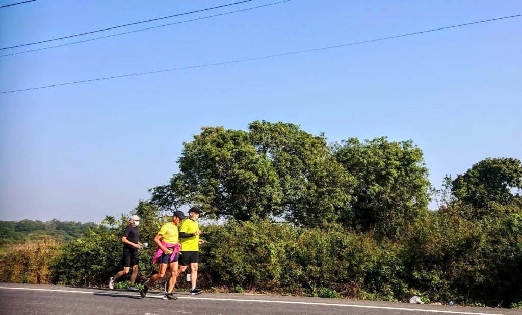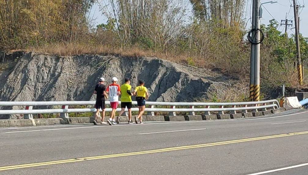 畢竟是40年一次的機會,阿昌在前幾天就勘查好路線,算好適合的休息點,一點也不馬虎;最絕的是,連小椅子小桌子都準備好了,果然是設想周到,頗有地主的架勢。(我們打趣的說:這根本是以跑步之名的郊遊踏青。)其實他本身就是玩家,也有開前導車帶隊的經驗;為了圓滿這一段路跑,放棄要陪跑的想法,專一作補給。阿昌有用口含手吹口哨的小技能,在我們三人跑步之間前後穿梭時,不時會吹二下來引導路線;那嘹亮的口哨聲從馬路邊傳過來,真的會感覺我們還是當年“少年郎”。