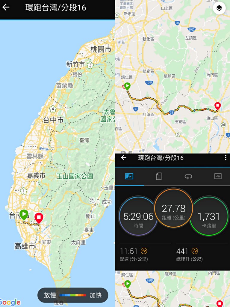 台南高鐵站>南一高爾夫球場(6k)>休息>長榮街>穿過19甲>高138>穿過國3>高賓汽車公司(4.5k)>休息>高138左轉台28>月世界遊客中心(4.7k) 與阿玉會合+休息>台28>麗湖探索教育園區(6.5k)>休息>台28>旗山火車站(4.7)>任務完成>前往阿昌老家>休整>搭車去美濃/逛美濃湖/晚餐美濃板條大餐。