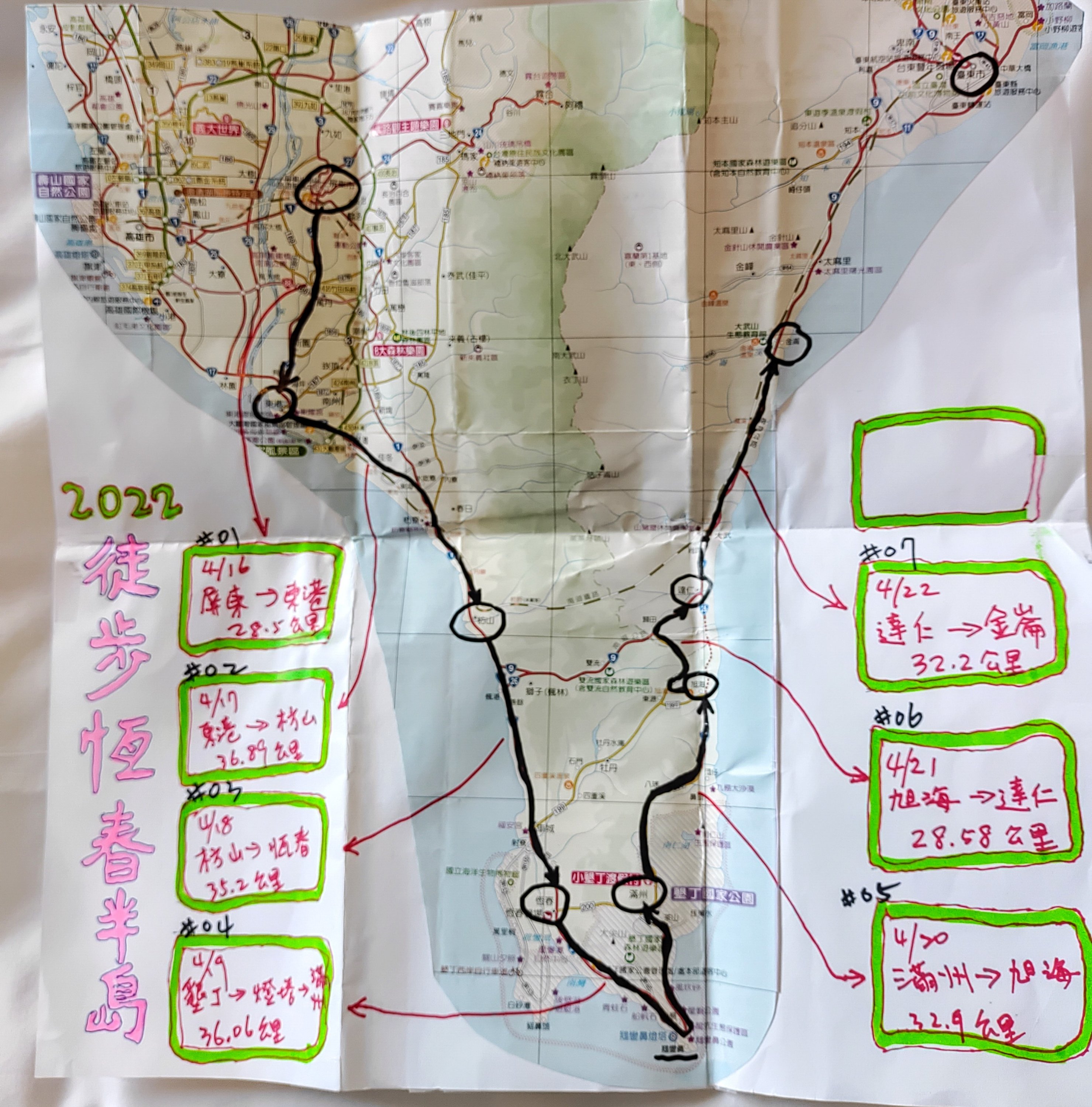 (註:意外和明天,不知道何者先到;阿昌在出發前三天,意外跌傷腳,不能同行,但每天都用網路或視訊,亦步亦趨的跟著走。阿玉即使公務繁忙,也依約參加頭尾二天,不辭舟車勞頓的趕來金崙,沒想到他是租了摩托車從台東騎來,準備明白的跟行與補幾;二人都用自己的方式,極力相挺。 因此,這次徒步是5人同行。)