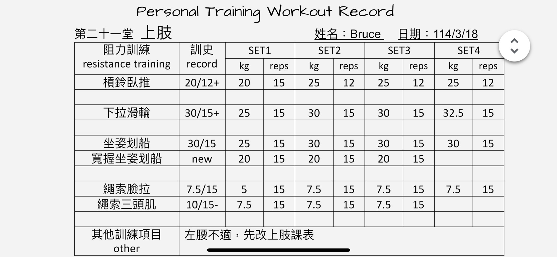 **左手臂/擴背肌與右邊差很多。但有感覺進步很快