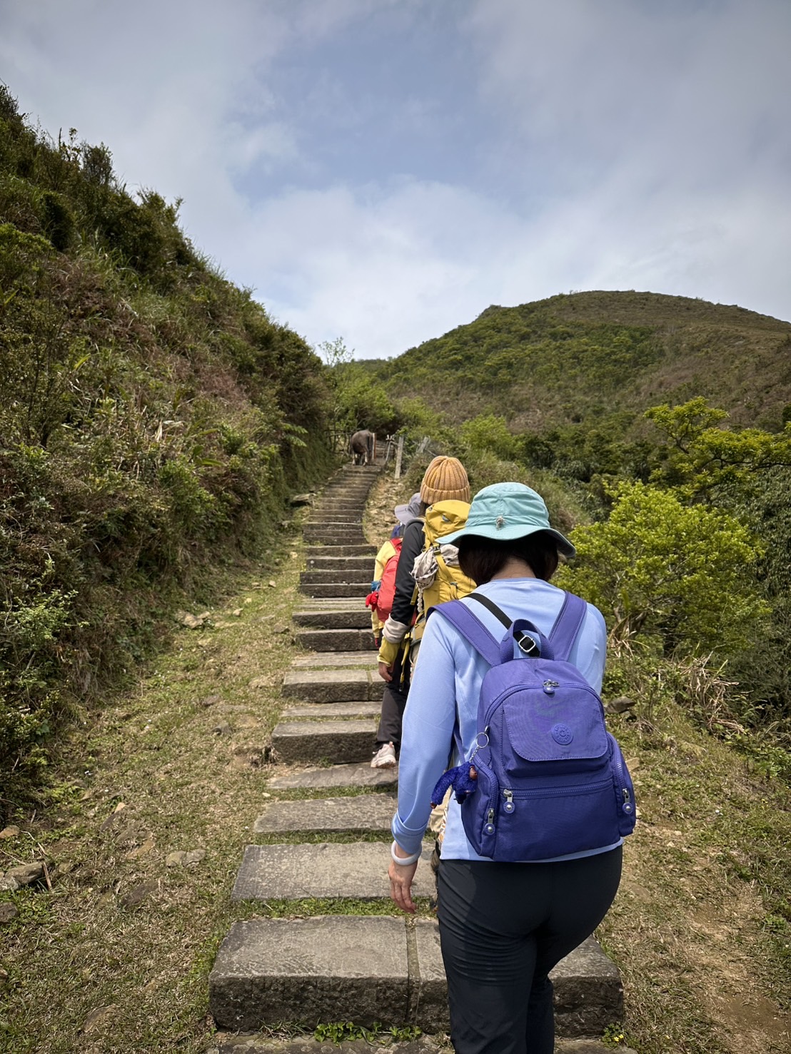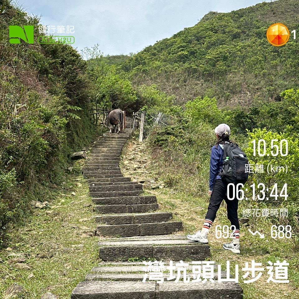 - 史上頭一遭,碰到牛擋路。翩翩就在最狹窄的路口。 雖然說牛很溫馴,但是那個山坡有一點點陡,如果牛脾氣發作,被踹傳下山;也是非常危險。 僵持了一陣子,只好沒路找路。 攀爬了一點點山頭繞過牛之後;繼續走。