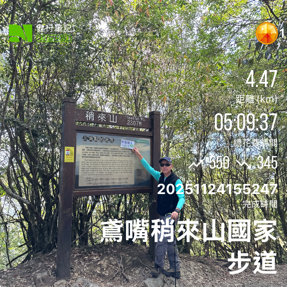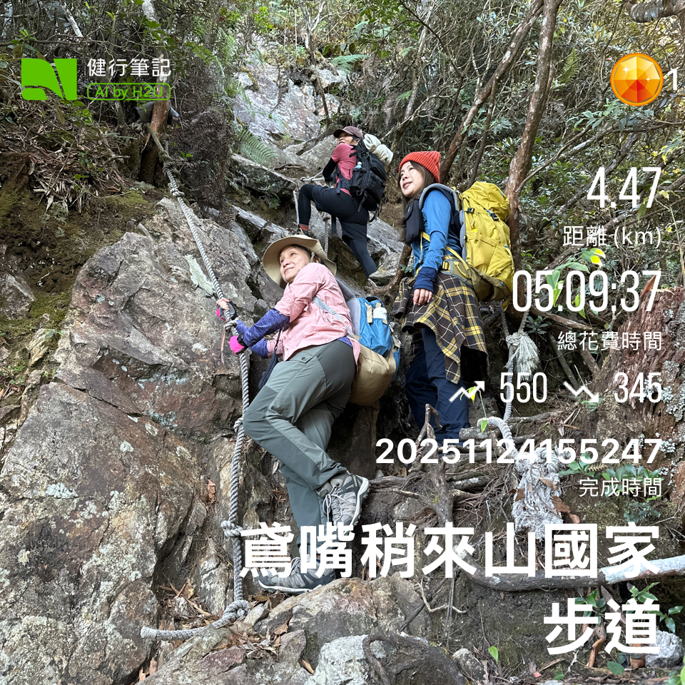 - 爬山當天(2025/11/24)早上,在27.5公里處,和林益安的「安將登山隊」會合。在這裡的登山口開始爬山。此處的登山口的入路徑有一點點難度;一開始就是陡坡,幾乎一路到登頂。