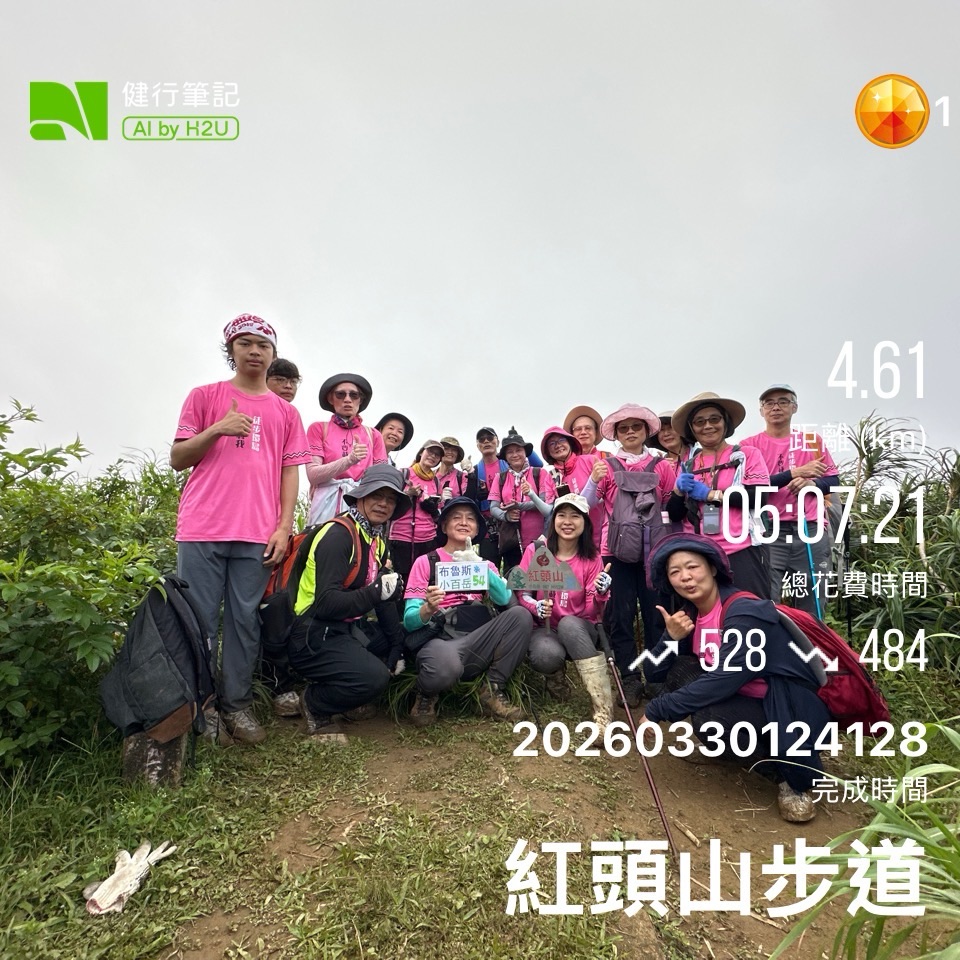 - 早上爬紅頭山。難度不低。全程泥濘道路,部份路段需要繩索協助;多處路段樹木擋路,稍微不注意而滑倒的叫聲,此起彼落。